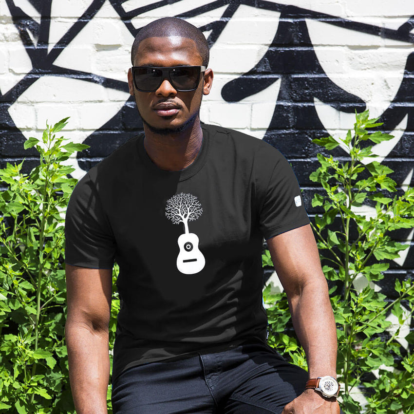 Dieses T-Shirt ist perfekt für angehende Gitarristen sowie für alle Akustikgitarrenliebhaber. Sein Design erinnert daran, dass Musik gut für die Seele ist, verweist aber auch auf die ökologischen Werte von PLB, die dem Instrument die Zeichnung eines Baumes aufgepfropft haben, um daran zu erinnern, woher es kommt.