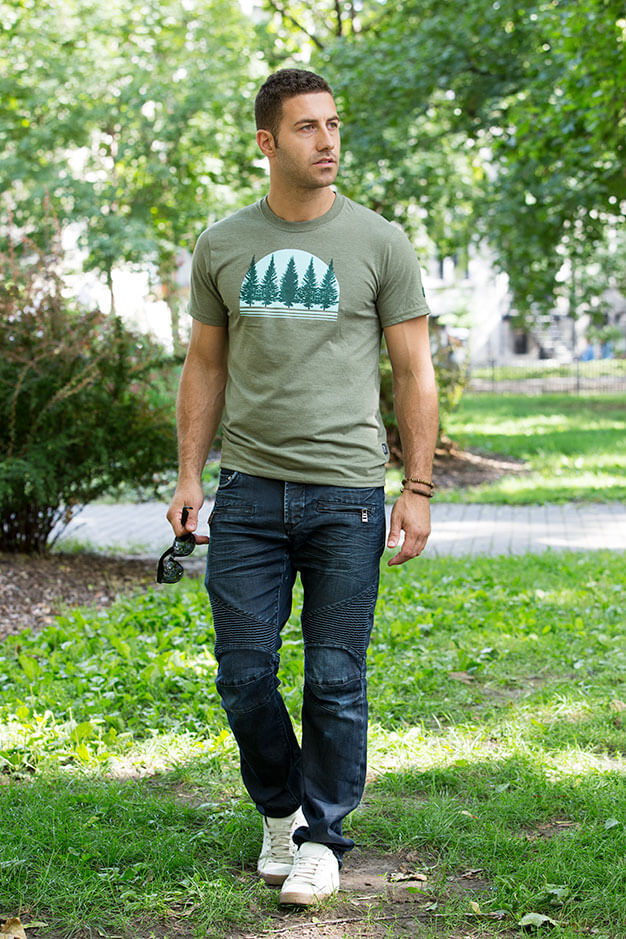 Ce design est issu d’une inspiration suite à un voyage dans Charlevoix, une région magnifique du Québec, où les paysages de conifères et de montagnes se greffent aux couchers de soleil. Le T-shirt de couleur verte évoque été, et le T-shirt de couleur grise évoque l’hiver.